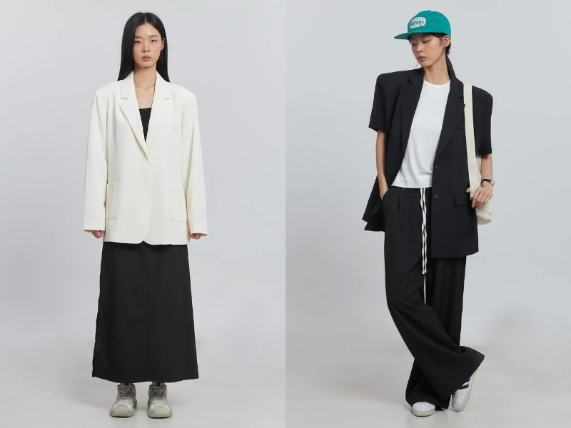 • Blazer + jeans + sneaker trắng: Nét cổ điển pha hiện đại, chuẩn vibe châu Âu.