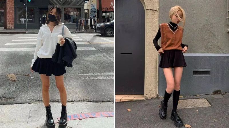 • Áo thun in hình + chân váy tennis + boots cao cổ: Đậm chất Mỹ những năm 90s.